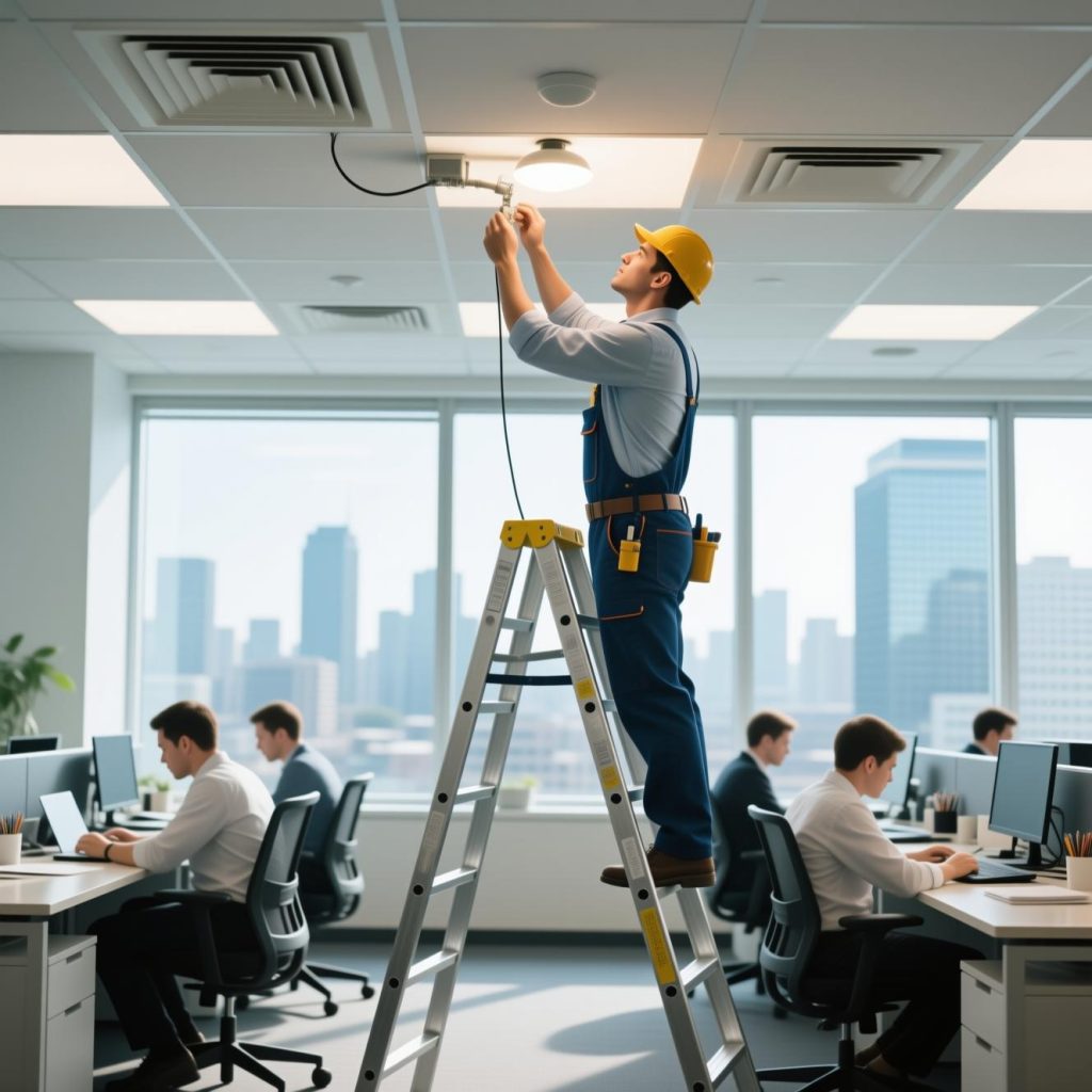• Garantimos que a infraestrutura do seu escritório funcione sem falhas. Desde a organização de cablagens, montagem de postos de trabalho até à manutenção corretiva de redes de água e luz. Somos o seu parceiro de manutenção externa, permitindo que a sua equipa se foque apenas no crescimento da empresa.”